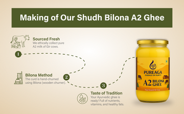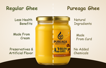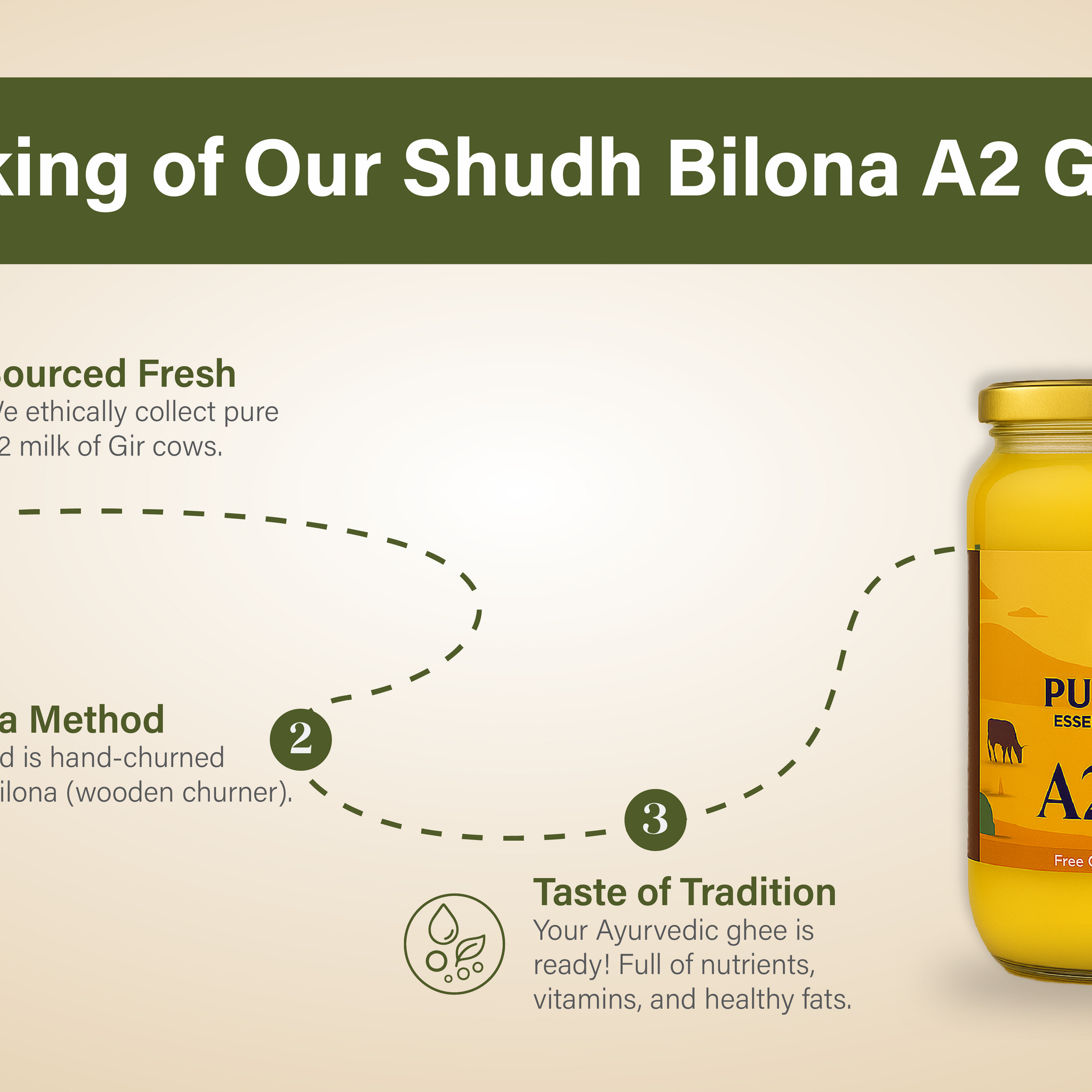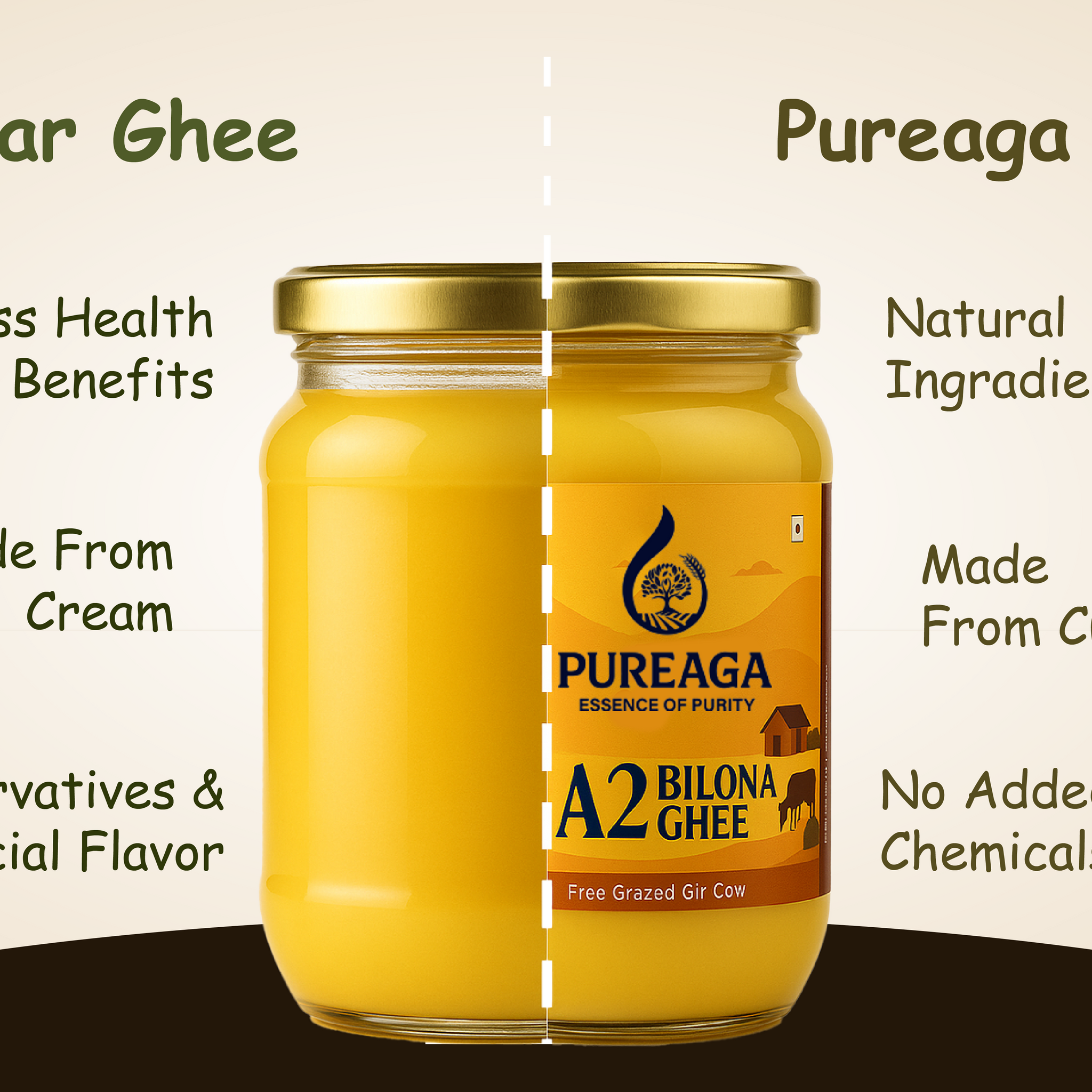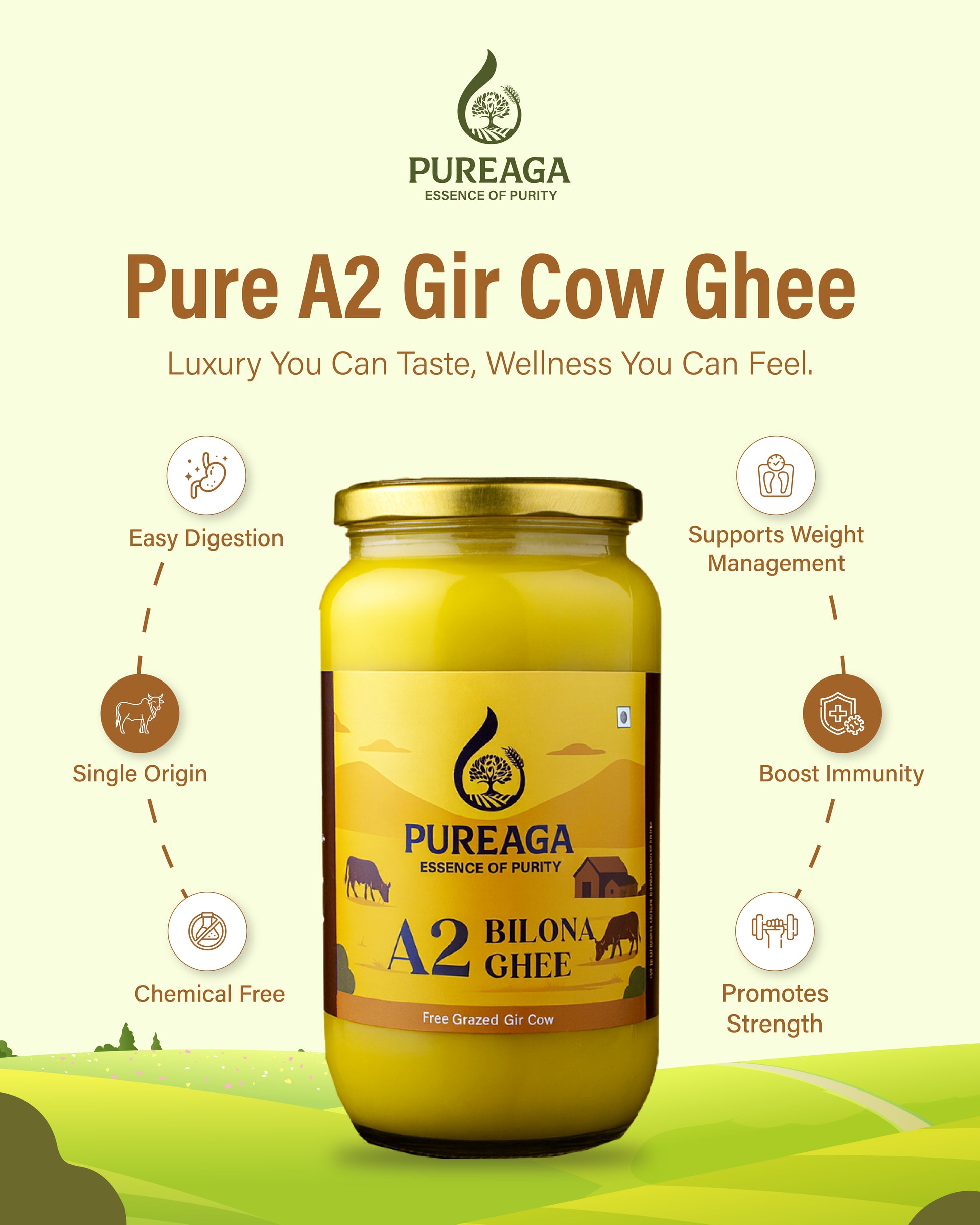 Our A2 Gir Cow Ghee is a premium, traditional product that stands out in several ways. It is made exclusively from the milk of indigenous Gir cows, which are known for producing a special type of protein called A2 beta-casein. This A2 protein is easier to digest and less likely to cause digestive discomfort compared to the A1 protein found in milk from many common cow breeds. We use the ancient "Bilona" method, a slow, hand-churning process that preserves the ghee's natural flavor, aroma, and a rich profile of fat-soluble vitamins (A, D, E, and K). This traditional process, along with the high-quality A2 milk, results in a product that is not just a cooking fat but a superfood with superior nutritional value.