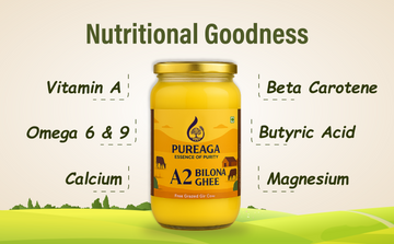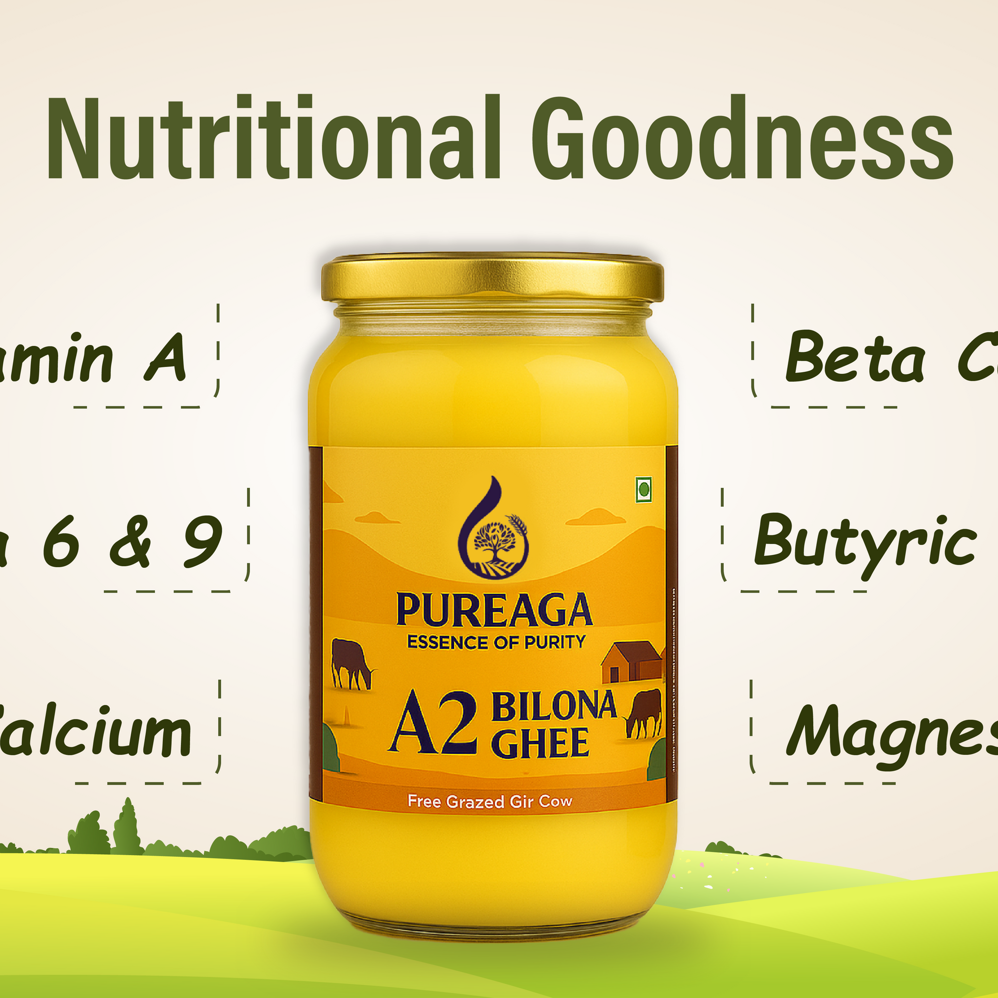 Contrary to popular belief, A2 Gir Cow Ghee is a source of healthy fats and is highly beneficial when consumed in moderation. It is rich in Omega-3 and Omega-6 fatty acids, along with Conjugated Linoleic Acid (CLA), which have been linked to improved heart health and metabolism. The butyric acid in our ghee nourishes the gut lining and stimulates digestive enzymes, making it easier to digest than other fats. With a high smoke point (250°C), it is ideal for all types of cooking, including frying, without breaking down into harmful compounds. A2 ghee is often recommended for those on a keto or paleo diet due to its pure fat content and nutritional benefits.